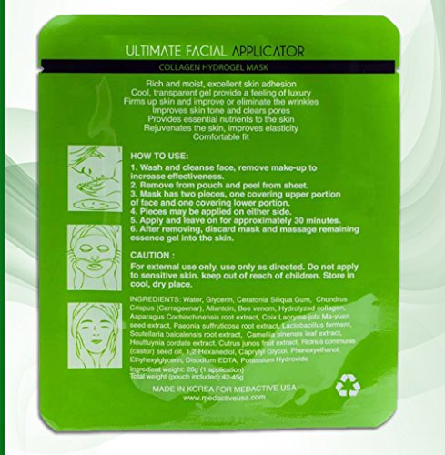 ULTIMATE COLLAGEN FACIAL APPLICATOR ,MASK it works FOR SKIN REJUVENATION 4 masks ULTIMATE FACIAL APPLICATOR COLLAGEN MASK Compared with the traditional standard essence masks, Hydrogel Mask provides extraordinary moisturizing quality that has been proven to be superior to the traditional essence masks by up to 18%. What's more, the new concept Thermo-Sensible Collagen Hudrogel mask gradually melts its active ingredients into skin, reacting to the skin temperature. . It also utilizes the bio-matrix method, which is safe for the human body. This gel mask has a great cooling effect and it keeps skin moisturized as well. The enhanced moistness and adhesive ability guarantees effective delivery of active ingredients into the deeper skin without damage, while resolving the problem of other sheet-type masks' losing active ingredients.minimize the appearance of fine lines and wrinkles in just 45 minutes. Skin looks and feels softer, smoother, and revitalized with a healthy glow. Continuously hydrates for fresher, more luminous skin and a younger-looking you. Deep hydration Collagen Produces a lifting effect Firms and invigorates skin Softens fine lines & wrinkles Results in as little as 30 minutes INDICATIONS AND USAGE How to Use: 1. After applying toner, pull out a mask sheet from the package and unfold. 2. Apply the mask sheet onto the face from the lower part (chin) of the face towards the forehead. 3. Remove the mask sheet after 30-40 minutes. Gently pat to absorb the remained formula into skin. - Use 2-3 times a week for the best result. - Do not reuse the mask sheet.Feature