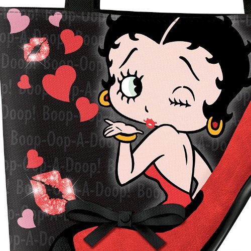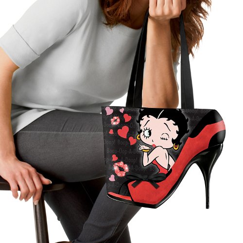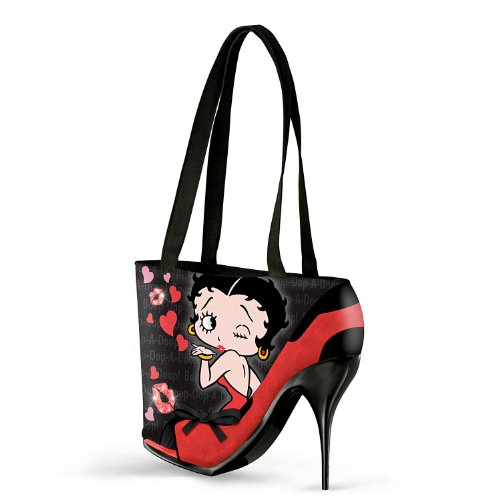 - Feature : Step out in high-heeled style with this one-of-a-kind Betty Boop Handbag, a custom design exclusively from The Bradford Exchange / The comic strip star is featured strutting her stuff on this unique black poly-woven fabric shoulder bag that also includes an actual 12-cm high heel! / Images of the ever-flirty Betty Boop as showcased on both sides with 3-D bows on the toe of the printed shoe / This Betty Boop handbag is also adorned with red hearts and glittering lips as well as an overall print of Betty's signature phrase "Boop-Oop-a-Doop™" / The bag also features black double handles and a top zippered closure