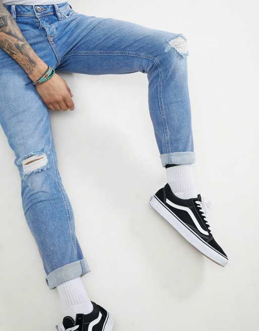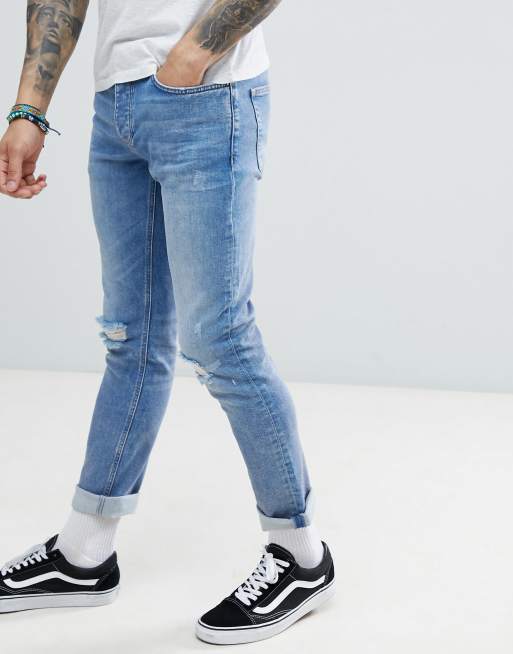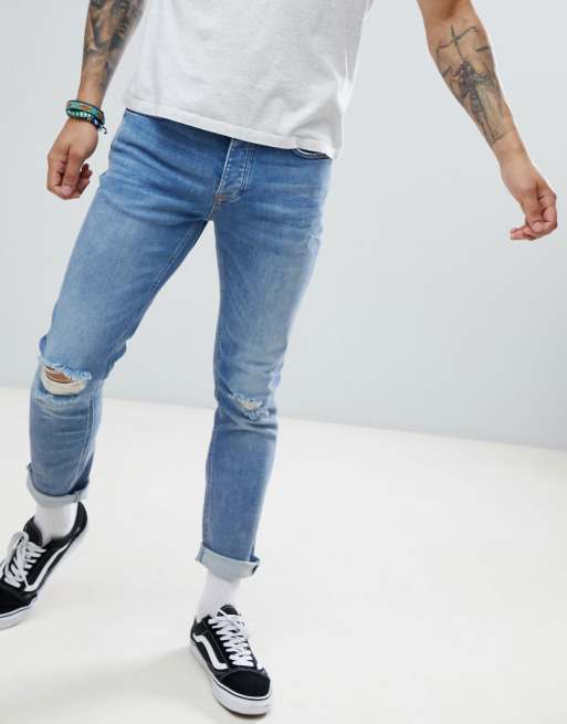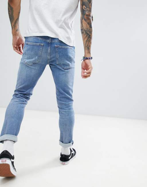 River Island Slim Jeans With Rips In Mid Wash Blue