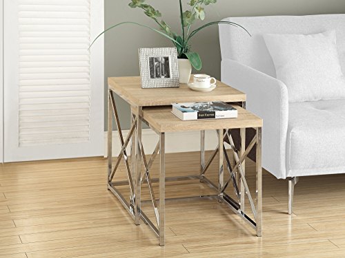 -. Feature : 2 piece nesting table set in a contemporary design / Natural reclaimed wood-look surface / Sturdy chrome steel metal "criss-cross" base / Use them as end tables or accent tables in your living room, den, office space / Large table: 20"lx20"dx20"h, small table: 16"lx16"dx17"h