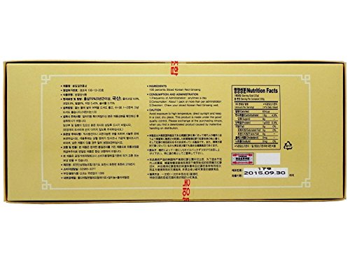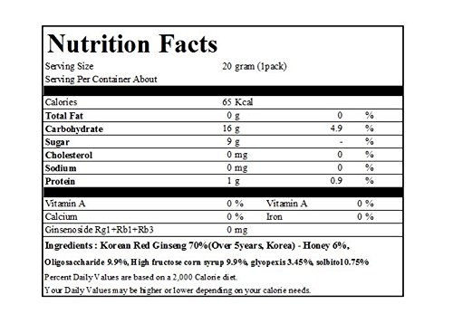 -. Feature : INGREDIENTS : Korean Red Ginseng 70%(Over 5years, Korea) - Honey 6%, Oligosaccharide 9.9%, High fructose corn syrup 9.9%, solbitol 0.75% / PACKING : 20g(0.7oz) x 10ea in Box(PE, PP, AL) / NUTRITION FACTS INFORMATION : Blood sugar adjustment effect Makes cell tissue healthy and helps the growth of cells Effective for healthy liver function Helps the generation of red blood cell Effective for adjustment of blood pressure, Helps cardiovascular function, women in menopause / Origin : South Korea, DIRECTION Take in 2~3 pieces to person's taste / Expiration Date : 2 years from manufacturing Date