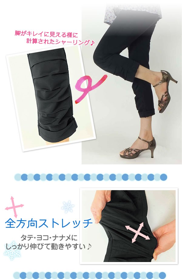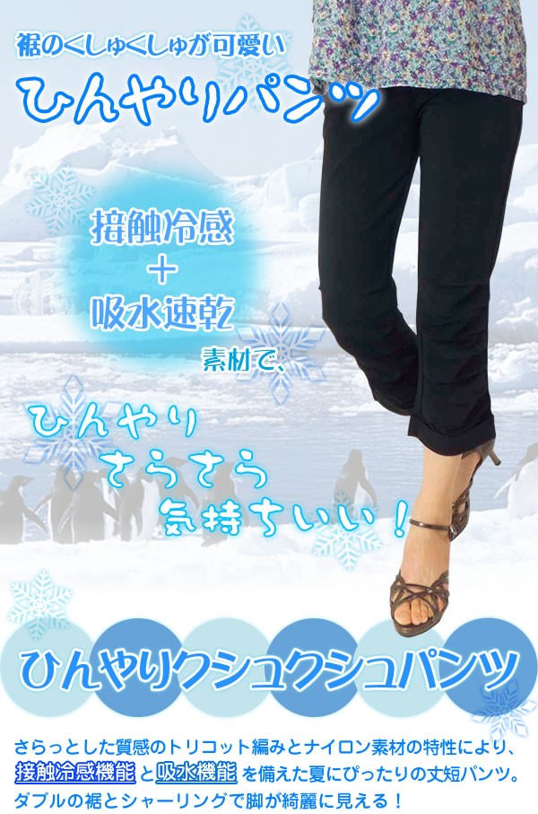 | 接触冷感&吸水速乾のひんやりパンツ。裾のクシュクシュしたシャーリングとダブルの裾で、脚が細くきれいに見える!さらさらの素材でひんやり気持ちいい♪ |