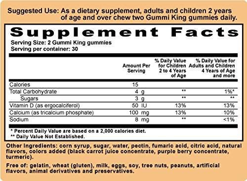 Gummi king Calcium plus Vitamin D gummies come in six natural fruit flavors (strawberry, lemon, orange, grape, cherry and grapefruit). They are vegan and gelatin free, and provide kids with calcium and vitamin d. Gummi king gummies are made with only the highest quality ingredients. Each bottle contains 60 gummi king gummies.Feature