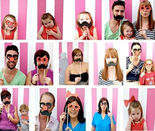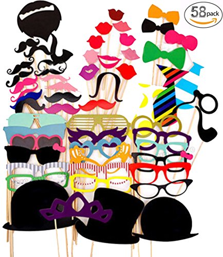 - Each pack contains 58 pcs props whichare printed on high quality thick cardboard in vibrant colors.The unique design such as Hat, Glasses, Mustache, Tie,Lips and other more
