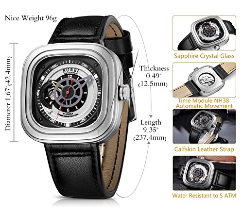 -. Title : BUREI Men's Automatic Watch Black Square with Sapphire Crystal Glass and Leather Strap