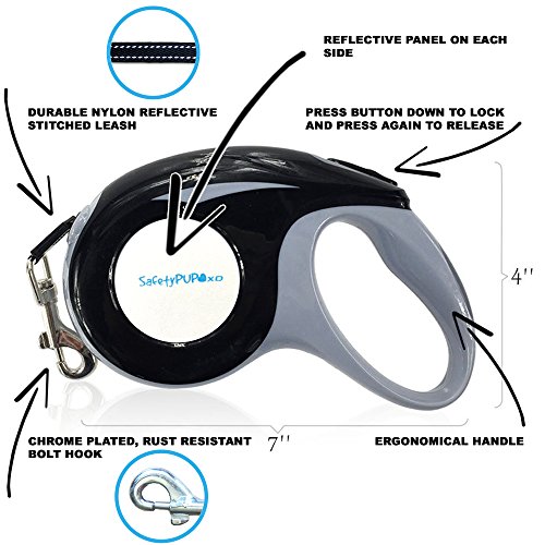 EXTENDED LEGNTH: The SafetyPUP XD retractable dog leash offers up to 16' of freedom for your pet, and can be used at shorter lengths on sidewalks or in confined areas, and then lengthened to allow your dog to play and explore in safer areas. ONE-BUTTON CONTROL: A secure Length-Lock system allows you to provide your dog with the proper leash length for any given situation, and then lock that length in place with the touch of a button. HI VISIBILITY DESIGN: For optimal visibility during the evening or in low-light situations, the SafetyPUP XD retractable leash incorporates both reflective threading down the length of the leash as well as a reflective stamp on the leash housing, ensuring a bright and visible profile any time of day or night. SLIM AND COMFORTABLE: Engineered for minimum mass and bulk, the SafetyPUP XD retractable dog leash is both light and easy to control, making it easy to use and easy to store. 0 |