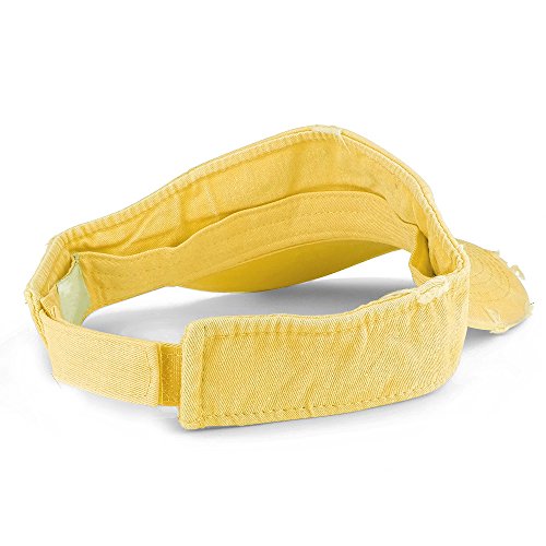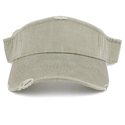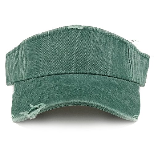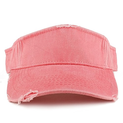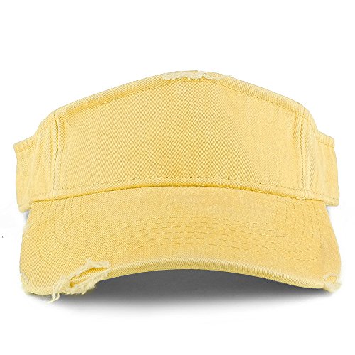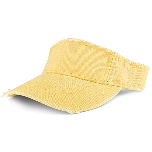 Product Description Our Frayed Pigment Dyed Garment Washed Distressed Adjustable Visor Cap is great for any summer outdoor event, trip and vacation. This frayed visor hat features heavy distressing on visor and band. Made of 100% Cotton. Frayed crown and visor. Stiff and pre curved visor. Fitted with an inner cotton sweatband. Finished with an adjustable hook and loop closure. One size fits most. 0