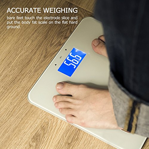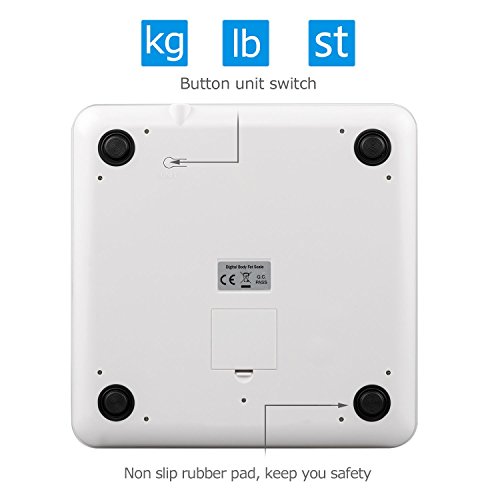 -. Feature : ✔ Health Monitoring: The Smart Weigh Body Fat Scale features a unique fitness inspired design to motivate you to stay in shape. Provide the most accurate and consistent weight readings to help monitor your health status. / ✔ High accuracy measuring: It is most empowering to know vital information about yourself. This scale measures body weight, body fat (%), body water (%), muscle (%), bone substance, BMI and calorie. / ✔ Memory function: Help your family stay healthy by using the features this scale has to offer. Record the parameters of the person to it, and choose the right person to monitor, store personal data for up to 10 users. / ✔ Exquisite Design : Large Blue Backlit LCD display. Easy to read even no light. Tempered glass for 396lbs/180kg capacity. The non-slip feet keep the scale from scratching your floors. / ✔ Multifunction: Auto On, Auto Zero, Auto Power-Off; Runs on 4 AAA batteries (not included); Button unit switch for kg/lb/st:lbs (on the bottom) & Two Electrode slice & Non slip rubber pad.