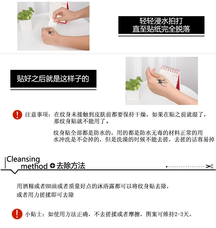 2.将有图案的一面贴于皮肤上(贴在摩擦少的地方哦!!)