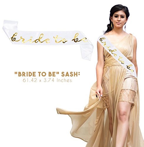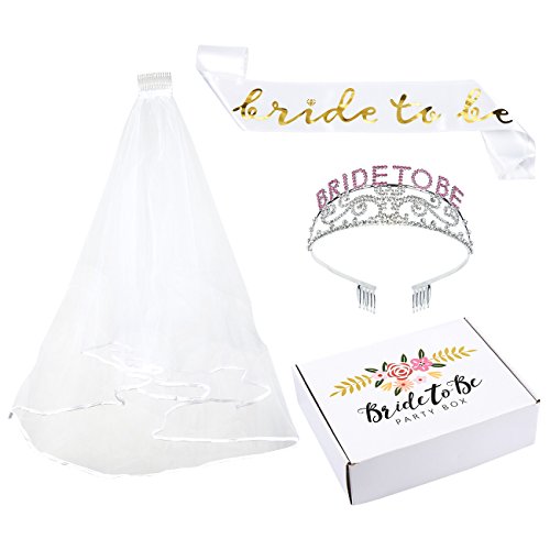 - SET INCLUDES: 1 Tiara crown, 1 white "Bride To Be" sash, and 1 veil with comb. This set is just the thing for your upcoming Bachelorette Party, Bridal Shower, or Engagement Party in mind!