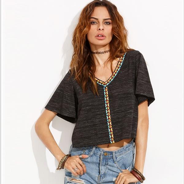 | Vネック 刺繍 ショート丈 カットソー トップス グレー gray 半袖 無地 【Vネック 刺繍 ショート丈 エスニック レトロ柄 トップス レディース 女性 黒 black 無地 杢グレー 霜降り セクシー グレー gray シンプル Tシャツ 春夏 半袖 ボヘミアン】 | |