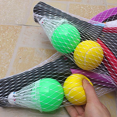 Features - Color: Delivery in random. - Material: Plastic. - Size: 55 * 27 * 6.5cm/ 21.65 * 10.6 * 2.6 inch (L*W*H). - Suitable for kids over three years old. - The badminton ball is durable and not easy to slip feather. - The PU ball is of good elasticity and good for long-term use. The water ball is very lightweight and fit for kids playing. All the balls are smooth in surface and safe for kids. - Perfect for parent-child game and rackets learning beginners. - Good for kindergarden and outdoor sports use; great gift for children.