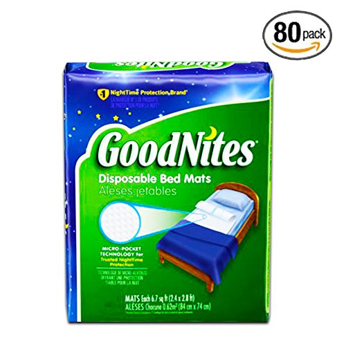 Studio : GoodNites Publisher : GoodNites Product Description Pack of 36 Disposable Bed Mats (Individually Wrapped). Each mat measure 30" in length x 36" in height to fit across a twin-size bed. Made with a soft, quiet material that helps your child sleep comfortably. The #1 NightTime Protection Brand*, with Micro-Pocket Technology for trusted nighttime protection. Adhesive strips help keep the incontinence mat securely in place on top of your child's bed sheet (recommended for use on 100% cotton/flannel sheets). Features the same super absorbent technology as LXL GoodNites Bedtime Pants. 0
