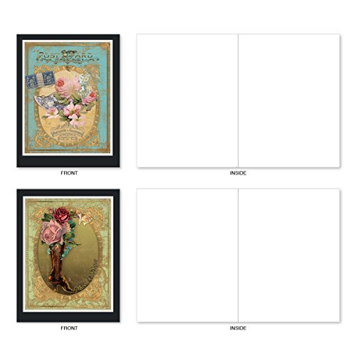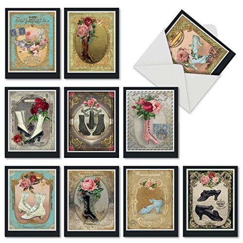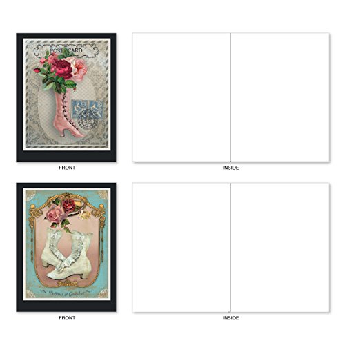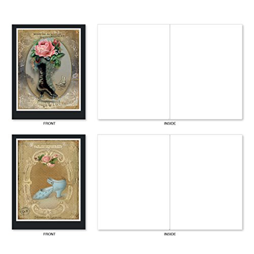 M6487OCB Vintage Kicks: 10 Assorted Blank All-Occasion Note Cards Featuring Victorian Style Footwear Collaged with Flowers and Ornate Frames, w/White Envelopes.