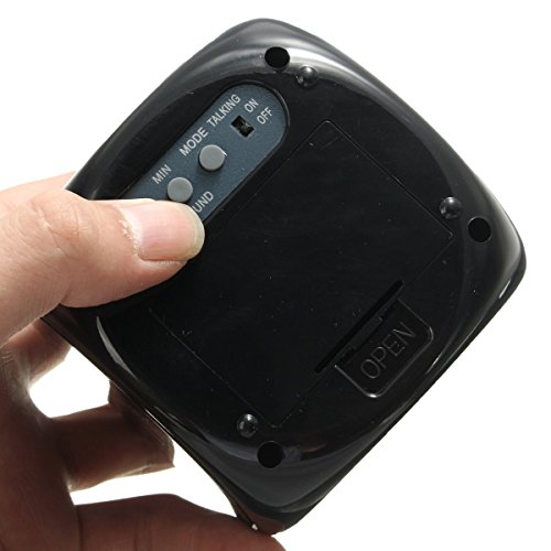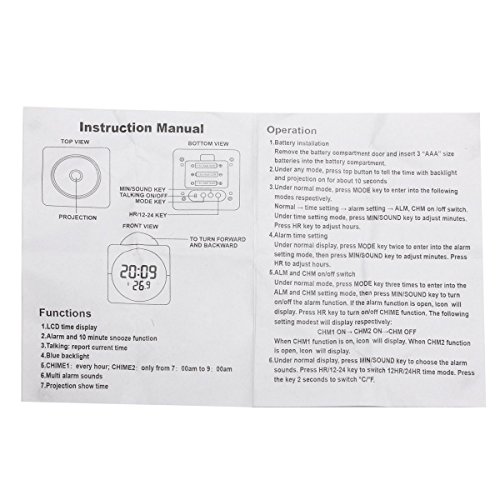 Features: LCD time + temperature display with green backlight. Alarm with 10 minute snooze function. Voice talking function: report the current time in English. Two kinds of CHIME report function: CHIME1--every hour; CHIME2--only from 7:00am to 9:00pm. Five kinds of alarm sound selectable. Two time modes available: 12 hours/24 hours. Projects the accurate time, projecting angle has a 90 degree range.