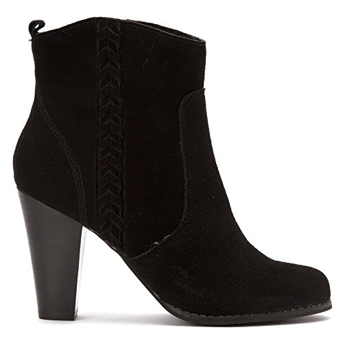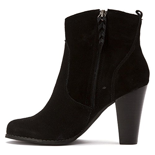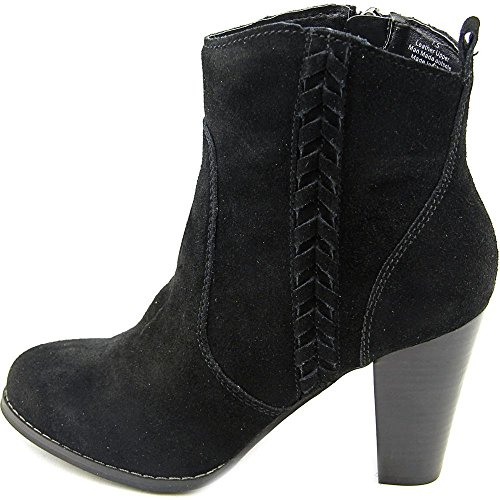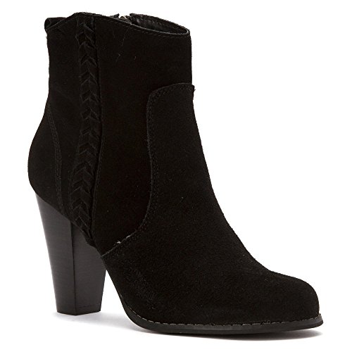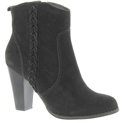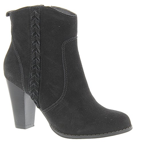 Studio : Volatile Publisher : Volatile Binding : Apparel Product Description A simple braiding accent lends a subtle western look to the easygoing yet saucy Volatile Wright high-heel bootie, which features a suede upper with a medial zipper for easy on/off. A tall, stacked-look heel adds lift and attitude for a confident stride. 0