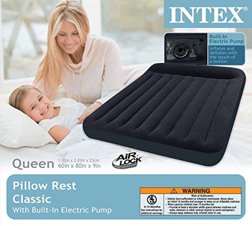 Product Features : Intex Pillow Rest Queen Airbed - Pillow top provides extra comfort and fluff - Leave your pillows at home - Easily inflates and deflates with a high-powered built-in electric pump - Inflates in less than two minutes! - Change firmness with the twist of a knob - Flocked sleeping surface for comfort - Quality tested 21.2 waterproof flocked top - 15 gauge sides and bottom - Duffel bag with shoulder strap included for storage and transport - Item Weight: 13 lbs - Weight limit: 600 lbs - Inflated Dimensions (Approximate): 12"(H) x 80"(L) x 60"(W) - Manufacturer Part Number: 66777E - Size : Queen - Brand : Intex