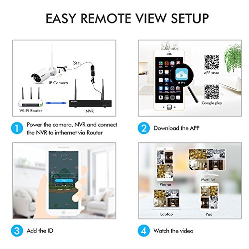 Quick and Easy Setup: you can download free app ¡°IP PRO¡± from Google Play or Apple AppStore; IP cameras connect to the NVR automatically; transmit range up to 98 feet; 2.4GHz Wireless Network (incompatible with 5GHz)