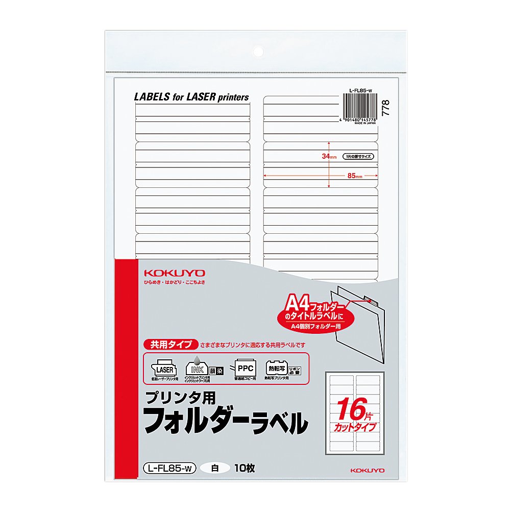 Kokuyo printer folder label A4 16 face 34x85mm 10 sheets white L-FL85-W