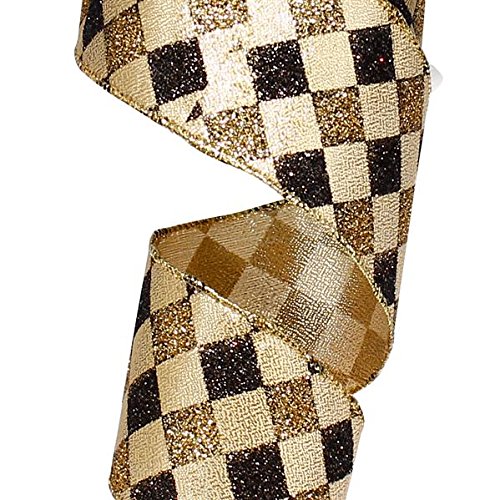 Harlequin Diamond Patterned Ribbon: Gold /Black/Beige Glitter Wired Ribbon 2.5" Wide x 10 Yards