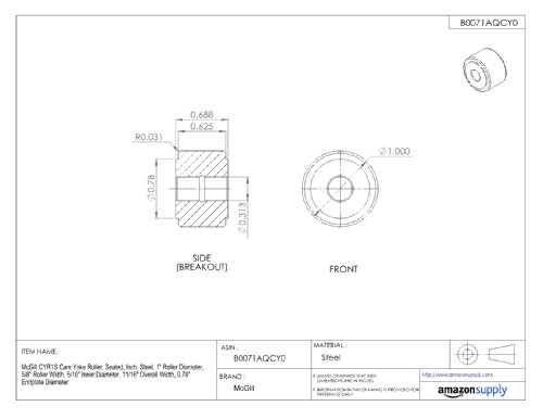 McGill CYR1S Cam Yoke Roller, Sealed, Inch, Steel, 1" Roller Diameter, 5/8" Roller Width, 5/16" Inner Diameter, 11/16" Overall Width, 0.78" Endplate Diameter