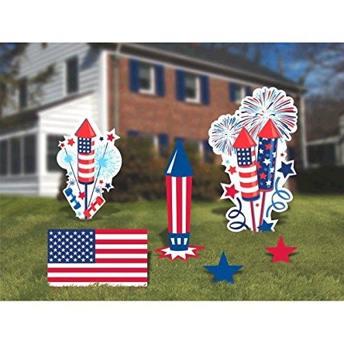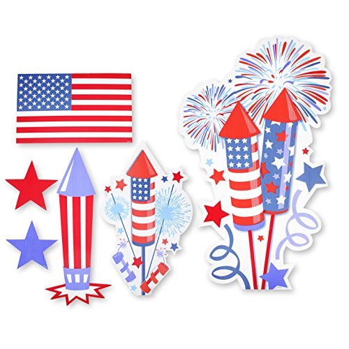 Includes: 2 Stars- 5-1/2 inches x 5 inches; 1 red, white and blue rocket - 6-1/4 inches x 15-5/8 inches; 1 American flag - 11-1/2 inches x 7-1/8 inches