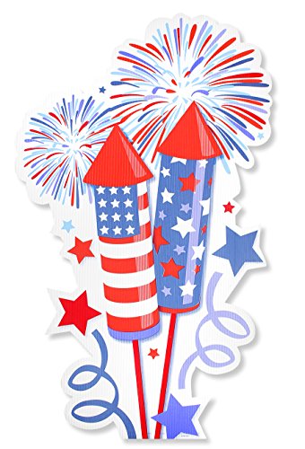 Includes 1 rocket with fireworks - 13-1/4 inches x 22 inches; 1 sign with two rockets, fireworks, and stars - 16 inches x 7 inches