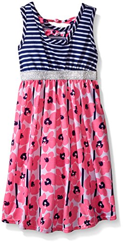 Girls Rule offers cute and comfortable styles with quality construction. She is adorable in this floral and stripe printed jersey knit dress with a high-low hem, glitter elastic waistband, and knotted jersey bows on back.