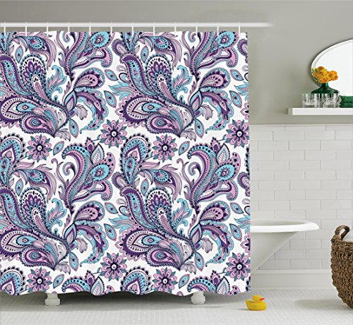 Paisley Shower Curtain Set by Ambesonne, Blue and Purple Large Flowers Leaves Floral Pattern Bohemian Style Country Print, Fabric Bathroom Decor with Hooks, 70 Inches, White Purple Blue