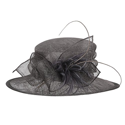 Product Description? Color : Gray ? Theme : Feather, Flower Leaf ? Crown Circumference : 23" ? Crown Height : 4.5" ? Brim Width : 4.5" ? Material : 100% Sinamay ? Feather Leaf Centered Medium Side Brim Sinamay Hat0