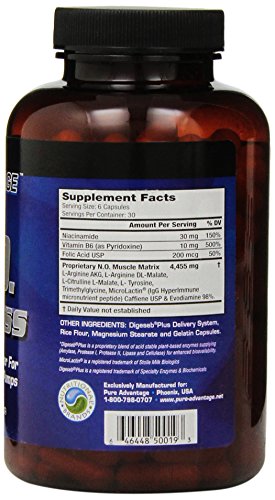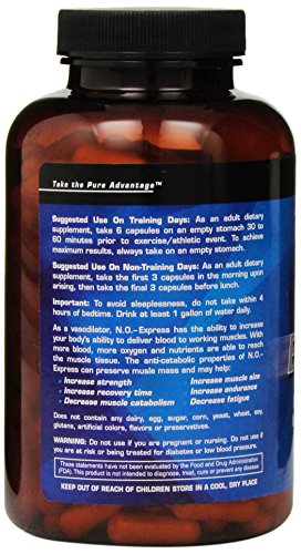 -. Binding : Health and Beauty -. Brand : Pure Advantage -. EAN : 0884831568676 -. Feature : With more blood, more oxygen and nutrients are able to reach the muscle tissue / The anti catabolic properties of N.O. express can preserve muscle mass and may help / Increase strength increase recovery time decrease muscle catabolism increase muscle size increase endurance decrease fatigue -. IsAdultProduct : 0 -. Label : Pure Advantage -. Manufacturer : Pure Advantage -. MPN : NB-50019 -. NumberOfItems : 1 -. PackageQuantity : 1 -. PartNumber : NB-50019 -. ProductGroup : Health and Beauty -. ProductTypeName : HEALTH_PERSONAL_CARE -. PublicationDate : 2013-02-05 -. Publisher : Pure Advantage -. ReleaseDate : 2013-02-15 -. Size : 180 Capsules -. Studio : Pure Advantage -. Title : Pure Advantage N. O. Express Nitric Oxide Booster Capsules, 180 Count -. UPC : 646448500193