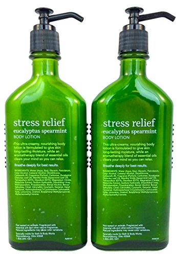 -. Binding : Misc. -. Brand : Bath & Body Works -. EAN : 0755746952723 -. Feature : TWO 6.5 fl oz. Bottles / Aromatherapy Body Lotion Stress Relief - Eucalyptus Spearmint / Fragranced with essential oils and other natural fragrances / Think clearly. Eucalyptus Essential Oil clears the mind to improve concentration. Spearmint Essential Oil is uplifting and helps the mind to focus. This ultra-creamy body lotion contains Natural Soybean Oil to nourish and moisturize skin and Glycerin to attract moisture to skin. -. IsAdultProduct : 0 -. MPN : 3929059 -. PackageQuantity : 1 -. PartNumber : 3929059 -. ProductGroup : Beauty -. ProductTypeName : BEAUTY -. Title : Bath & Body Works Eucalyptus Spearmint 6.5 oz Aromatherapy Lotion - 2 PACK -. UPC : 755746952723