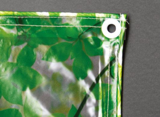 UV99%カット!夏場はUVカット・雨除けに、冬場は風除け・雨除け・雪除けに。細かい間仕切りで暖房や冷房の効率もアップ、省エネ効果も抜群!雰囲気のあるリーフ柄で周りが明るく、目隠ししながら採光できます。ハトメ穴付きで、あっと言う間にカンタン取り付け!