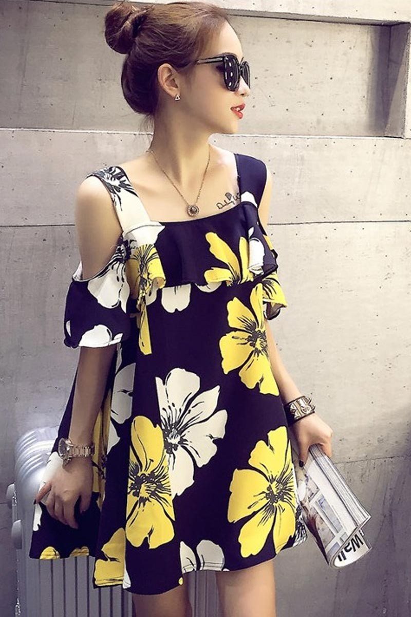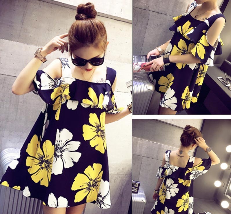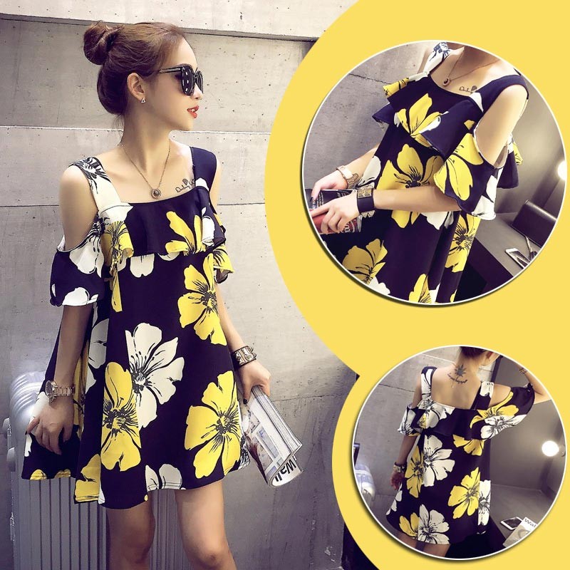 ブラック地に大きなイエローのフラワープリントが花咲くキュートなワンピ♪