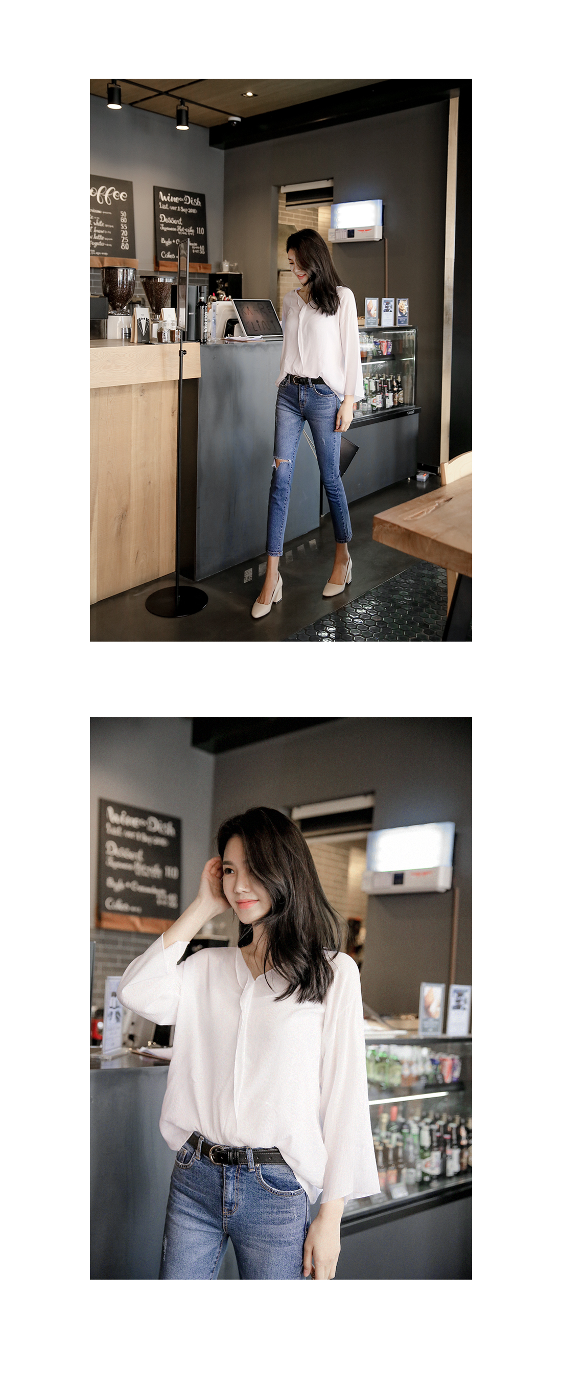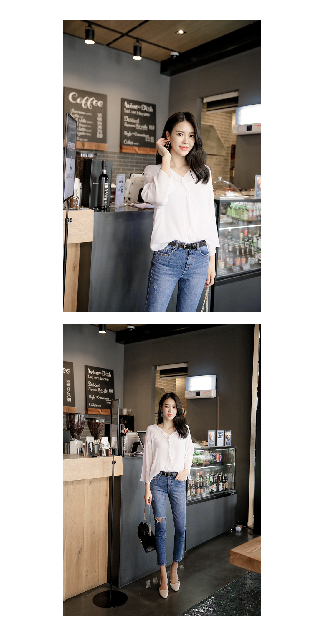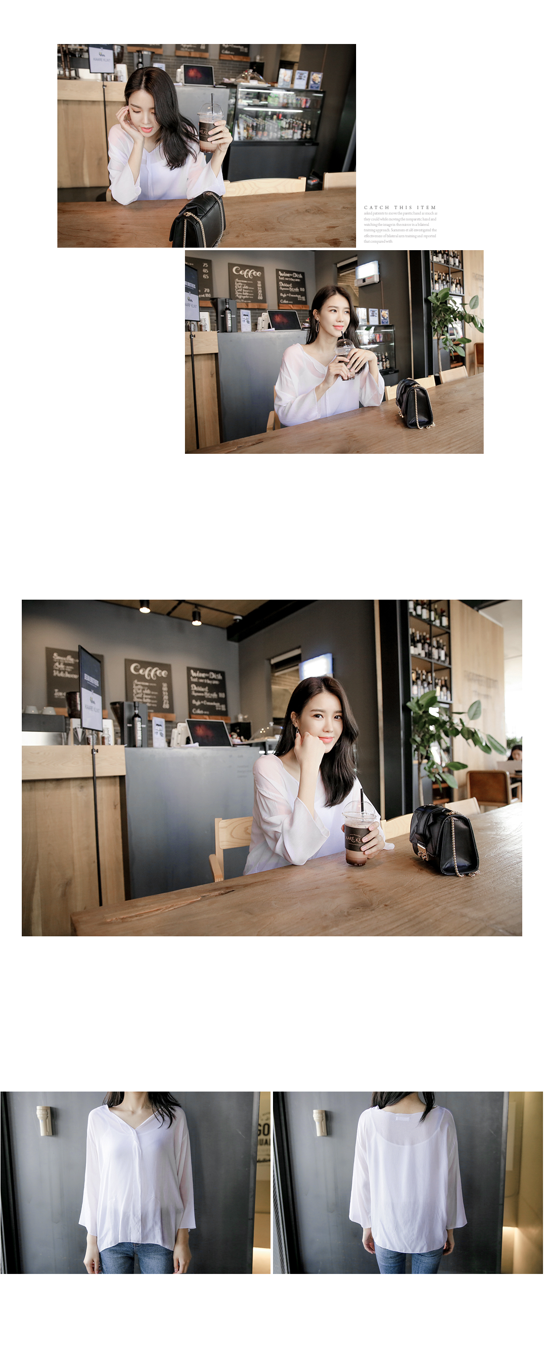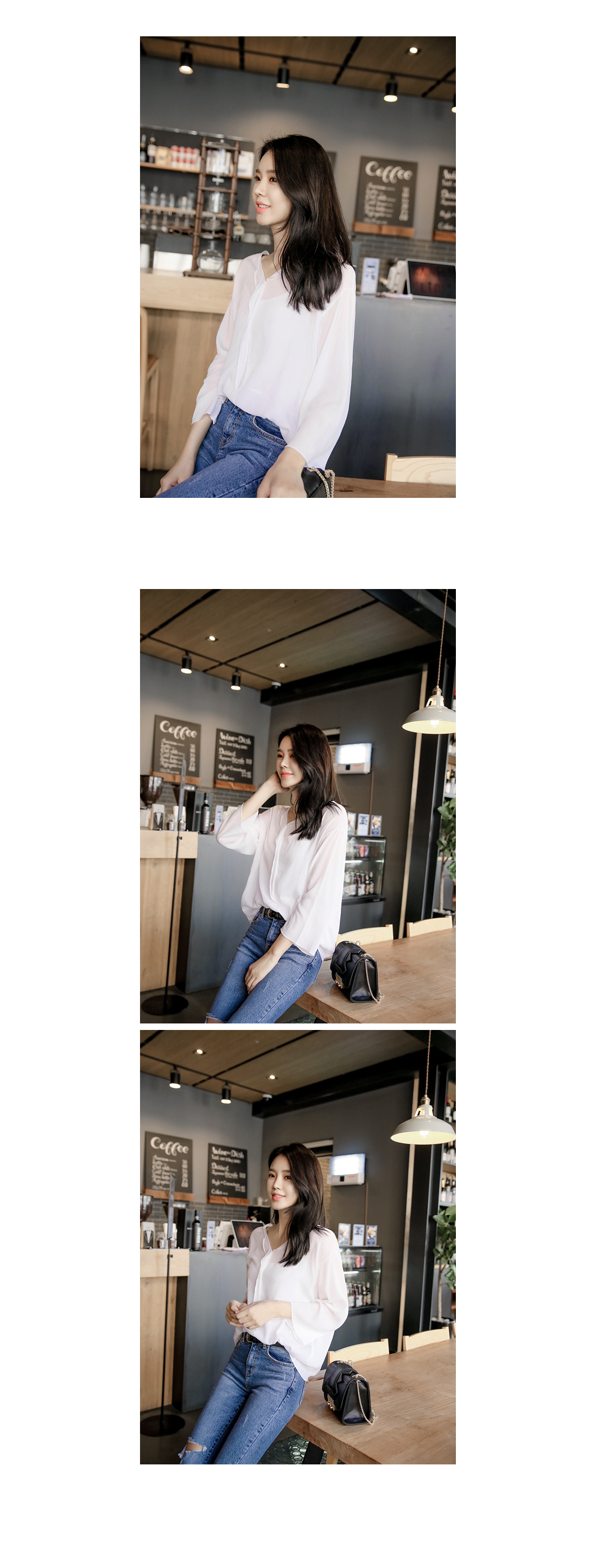 여리여리한 분위기의 코디룩을 연출해드리는 블라우스예요~^^브이넥 크라인과 프론트 중앙 라인으로쇄골라인과 넥 라인을 한층 더 페미닌하게 연출해드린답니다~여유있는 핏감으로 누구든지 편안하게 착용할 수 있어요~베이직하고 모던한 디자인으로 다양한 아이템들과 데일리하게 연출할 수 있답니다~