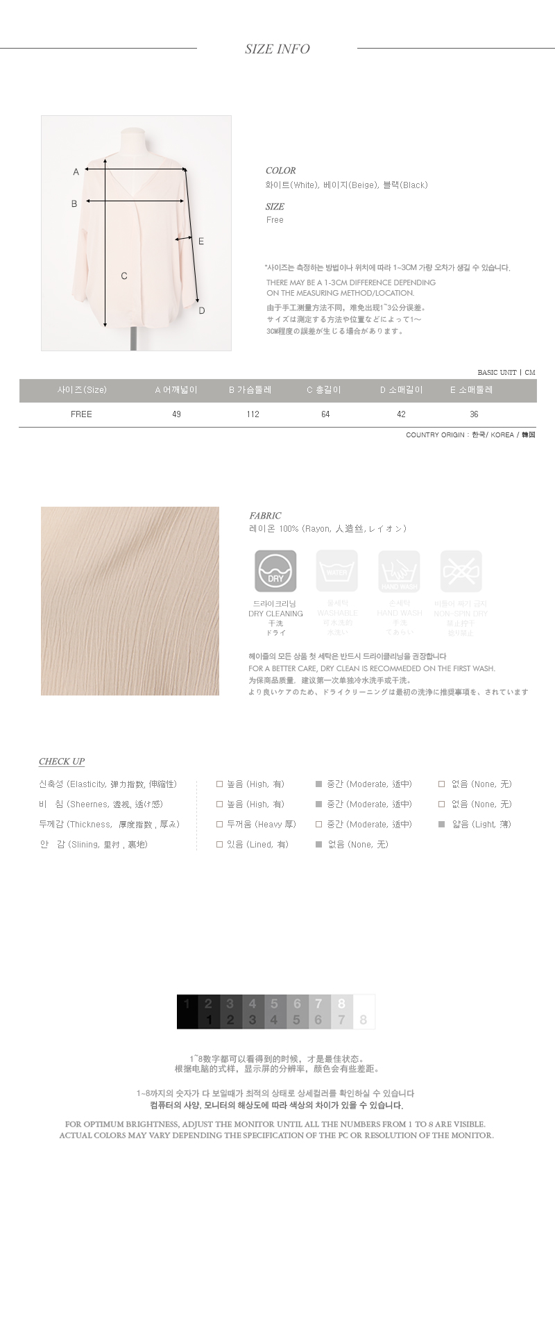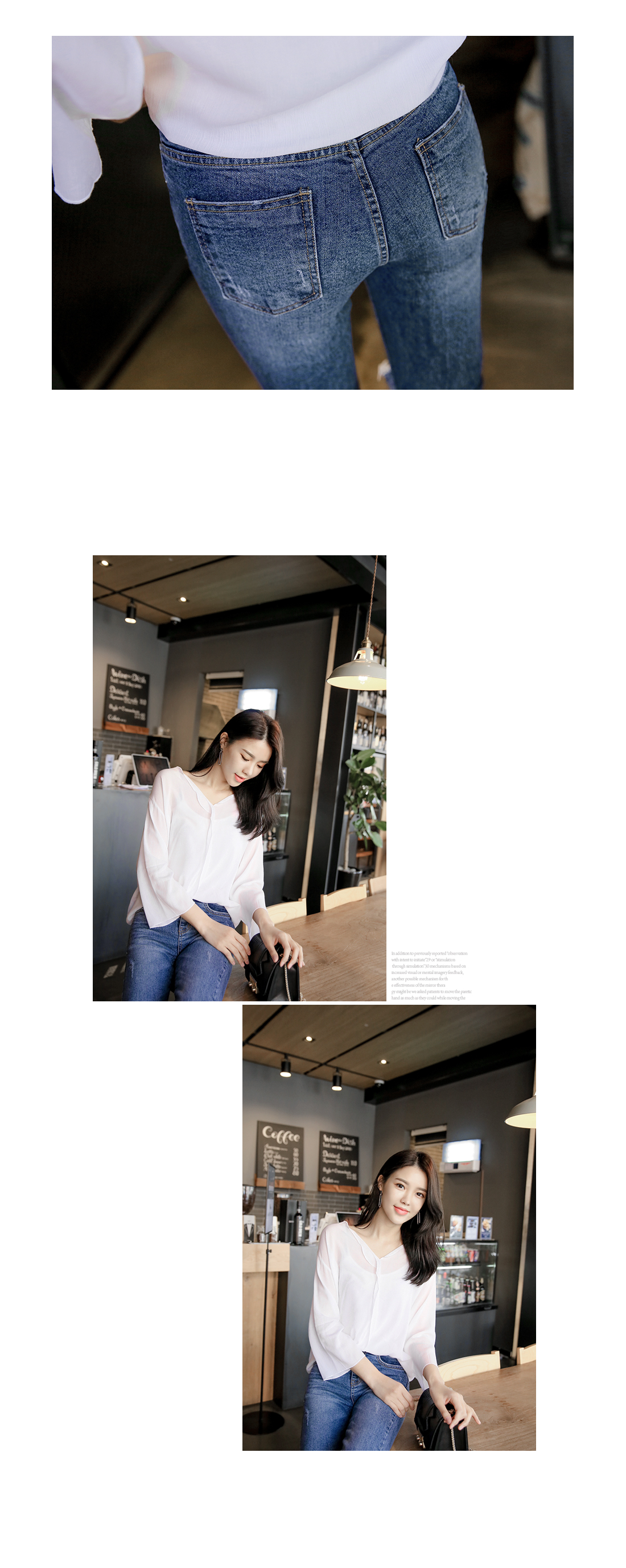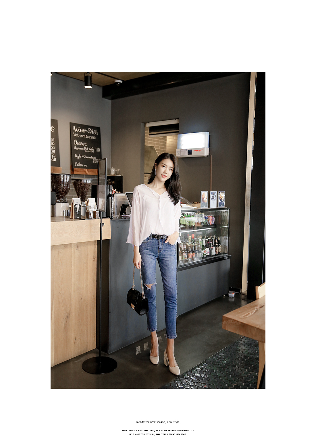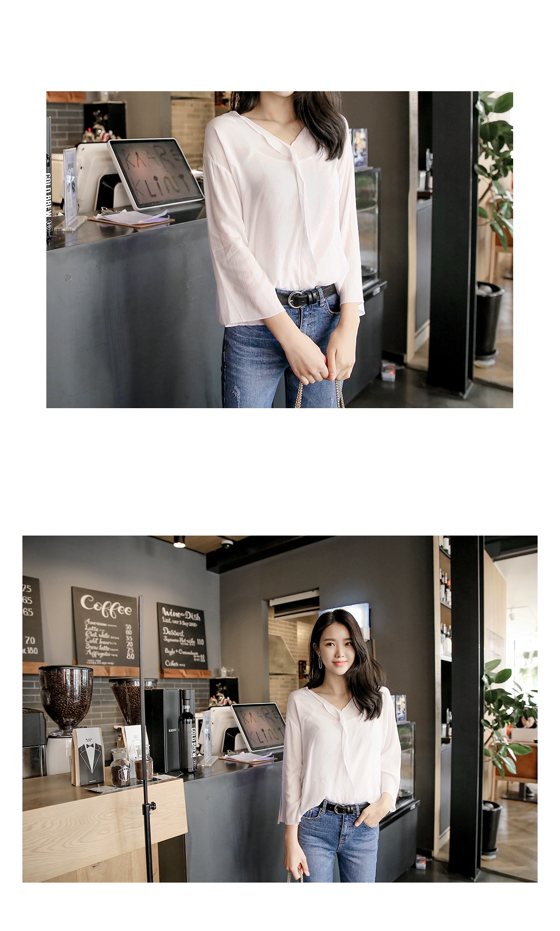 여리여리한 분위기의 코디룩을 연출해드리는 블라우스예요~^^브이넥 크라인과 프론트 중앙 라인으로쇄골라인과 넥 라인을 한층 더 페미닌하게 연출해드린답니다~여유있는 핏감으로 누구든지 편안하게 착용할 수 있어요~베이직하고 모던한 디자인으로 다양한 아이템들과 데일리하게 연출할 수 있답니다~