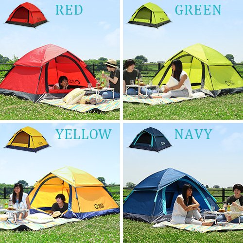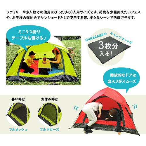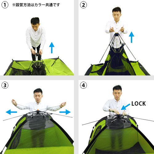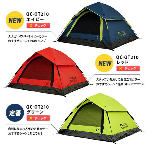 Quick camp's one-touch tent is a design in which the frame and the tent body are united so that the tent self-sustains immediately by pulling the string.