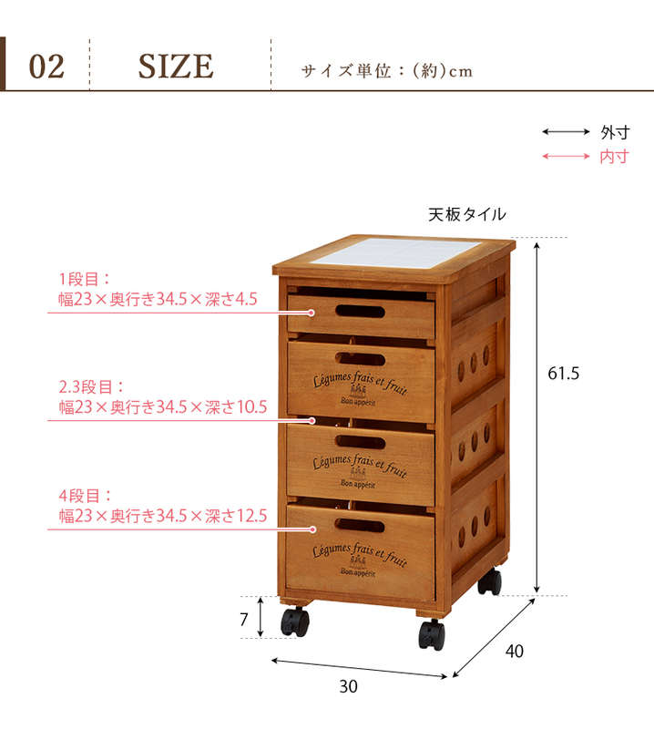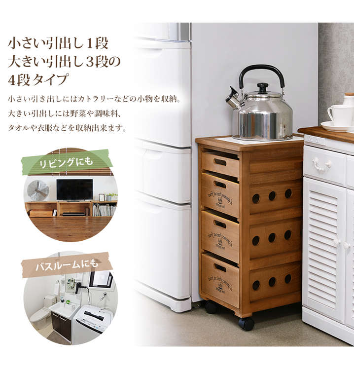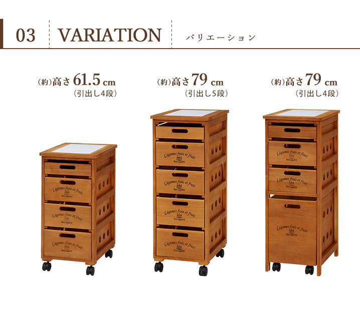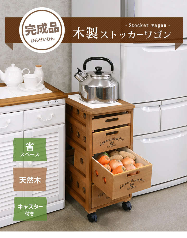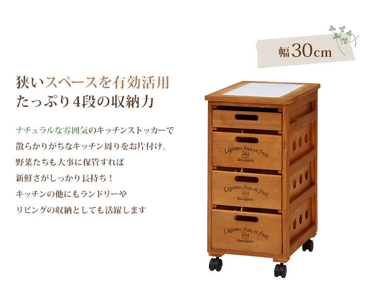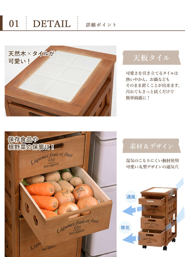 ●キャスター付きでラクラク!通気性のよい木製で野菜ストッカーにピッタリ。タイル天板は熱い鍋などを置くのにも便利。
