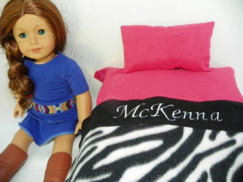 -. Feature : Zebra P.R.Int blanket with black border, salmon pink microfiber sheet and pillow / Great pattern. Striking contrast between zebra P.R.Int and salmon pink sheet and pillow / Embroidered with American Girl Doll MCKENNA's name. / Approximate size: Blanket and sheet 20" x 15", Pillow 6.5" x 3" / Fits 15-18" doll's bed, trundle bed or bunk bed