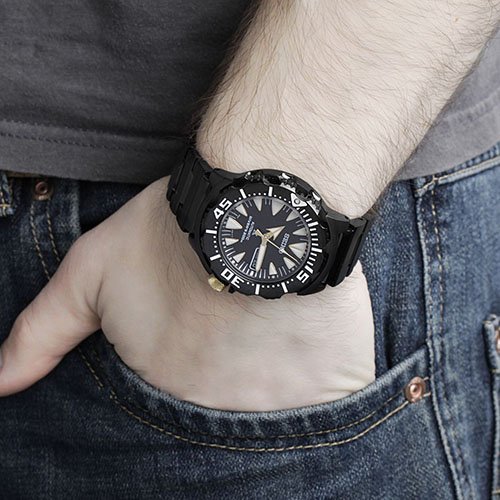 If youre a man with even the slightest fashion sense then you know that typically theres a time and a place for every accessory That makes it all the more rewarding when you find one that can be worn across multiple settings and for any occasion This Seiko Prospex Pro Divers is the epitome of a casual watch that works as the perfect wardrobe component for a diverse array of environments Its black band is made of a strong stainless steel which makes for a slick but bold appearance This aspect is what makes this timepiece perfectly fitting for a more formal setting or event Itd go well with any business suit or button-down trousers for while youre on the job Its casing is fashioned out of a sturdy stainless steel thats 42MM wide and 13MM thick Not only does this promise superior durability but its dark shade of black adds a cool yet refined edge as well Its applied contribute to its casual aura in a straightforward kind of way and the gold details create a subtle yet noticeable contrast against the black dial The dark features especially add to the robust look of this watch making it fitting for your daily informal dress code or a night out with the guys Not only does it look tough on the outside but its also built to be resilient Its dial is guarded by a hardlex crystal and has a water resistance of up to 200 meters so neither water nor wrangling will disable this bad boy In addition it uses a Japanese Quartz movement promising accuracy and requiring little upkeep The structure of this timepiece is an ideal mixture of simple laid-back and gallant with its tough makeup and its bold guise and itll do for any activityFeature