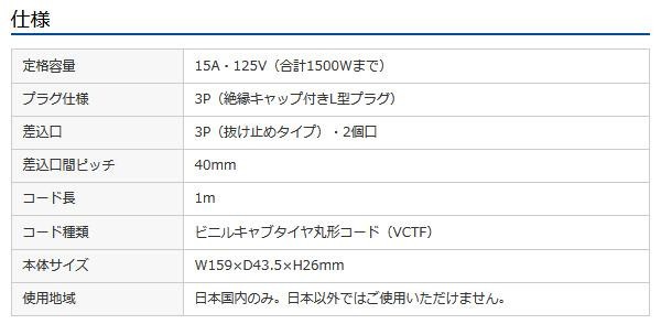 | 2個口(3P抜け止め)、VCTFコード仕様、3Pプラグ(絶縁キャップ付き・L型)のタップです。電源状態が確認できる通電ランプ付。裏面にマグネットが付いているので、スチールのデスクなどに仮固定することができます。メンテナンスがしやすく便利です。 |