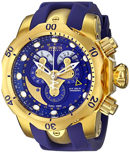 -. Binding : Watch -. Brand : Invicta -. Color : blue -. Department : mens -. EAN : 0886678151073 -. Feature : Chronograph functions with 60 second, 30 minute and 1/10 of a second sub dials; date indicator on inner bezel, day of the week and month windows / Blue dial with gold tone and white hands and hour markers; luminous; unidirectional bezel; screw-down crown and pushers; tachymeter; flame fusion crystal; 18k gold ion-plated stainless steel case; blue polyurethane strap with 18k gold ion-plated stainless steel inserts / Swiss-quartz Movement / Case Diameter: 54mm / Water Resistant To 3280 Feet -. Label : Invicta -. Manufacturer : Invicta -. Model : 14465 -. MPN : 14465 -. NumberOfItems : 1 -. PackageQuantity : 1 -. PartNumber : 14465 -. ProductGroup : Watch -. ProductTypeName : WATCH -. Publisher : Invicta -. Studio : Invicta -. Title : Invicta Men's 14465 Venom Analog Display Swiss Quartz Blue Watch -. UPC : 886678151073
