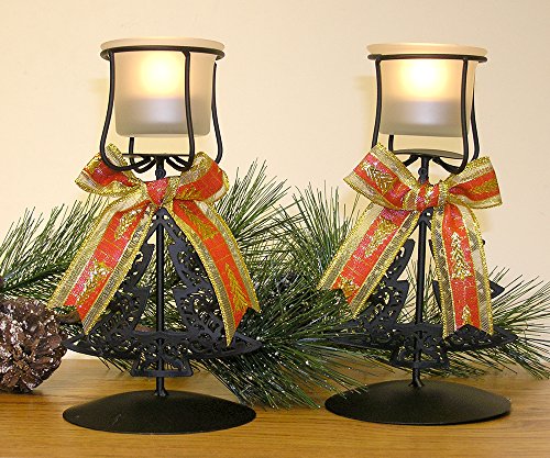 - TREE CANDLE HOLDER. Set of 2 tall xmas tree candle holders. Black wrought iron design with a Christmas Tree base. Frost glass votive holder with wax tealight candles included.