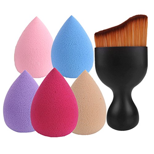 CCbeauty 5+1Pcs Professional Makeup Sponge Blender+Angled Top Contour Brush Set Best for Liquid Foundation Powder Cream Concealer Shadow Blusher Cosmetics