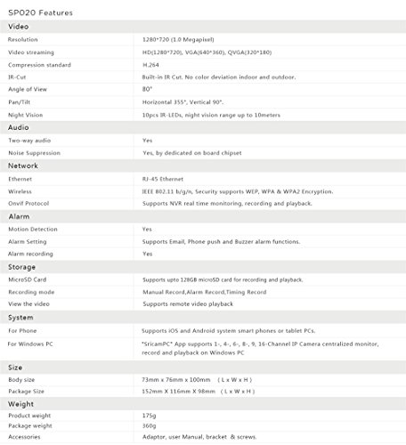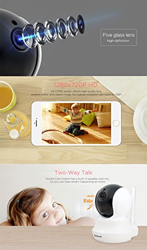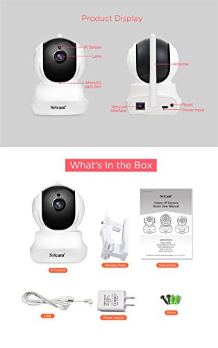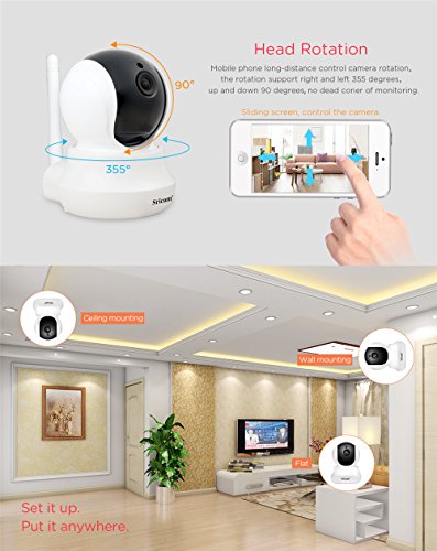 -. Feature : Smart Motion Alerts: Supports motion detection alarm push notifications to your smart phone,gets immediate notifications anywhere,anytime / Infrared Night Vision: Cutting-edge night vision technology allows you to get a crystal clear picture even when it's dark, 10 pcs Infrafed night vision LED lights,clearer night viwe. / Head Rotation: Mobile phone long-distance control camera rotation, the rotation support right and left 355 degrees, up and down 90 degrees, no dead coner of monitoring / Store your footage anywhere you want: Sricam camera can also record locally to a MicroSD card(not included).Build in SD card slot,support up to 64GB MicroSD Card.You can see what you missed by Playback / Sricam App: Supports iOS, Android smart phones or tablet PCs. Plug and Play.