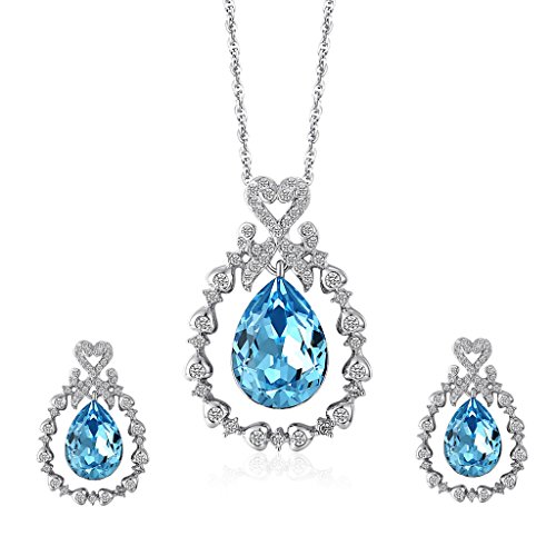 Lelekiss Aquamarine Crystal Fan-Shaped Dangle Drop Earrings and Pendant Necklace Set The perfect gift for someone you love! This jewelry set includes a necklace and a pair of pierced earrings, all in delicate fan-shaped silhouette. Grace your look with the elegance of these dangle drop earrings and pendant necklace, decorated wih a central pear-shaped aquamarine Swarovski elements crystal pendant framed in clear CZ diamonds.