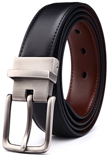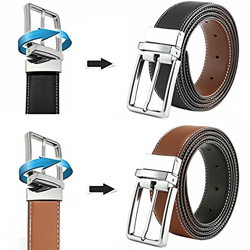 -. Feature : REVERSIBLE--Getting two belt colors with paying for just one Belt!! Rotated buckle making it easy to reverse the belt from black to coffee and vice versa, you can make this change to match different dresses. / TRIM To Fit-- PERFECT RATCHET SYSTEM , this new system makes it so easy to take off the strap to cut for your desired size, just buying a bigger size than your waist and easy to adjust, no worry about of wrong size any more! / MAXIMUM DURABILITY: This Leather belt with innovative improvement by Micro Fabric provides a maximum durability for deforming resistance in the holes, and the stitched strap fits perfectly in the ratchet buckle, which made of Zinc Alloy with high quality decoration for scratch resistance. / GIFT IDEA--An attractive paper gift box is provided to protect the belt during the whole transportation for its safety arrival. and also enable you present it as a gift to your family or friend. / GUARANTEE-- 100% guarantee available. Any reason makes you dissatisfy with this belt within the GUARANTEE PERIOD, let us know and we will make it right, Full Refund or a Free Replacement, whichever you prefer.