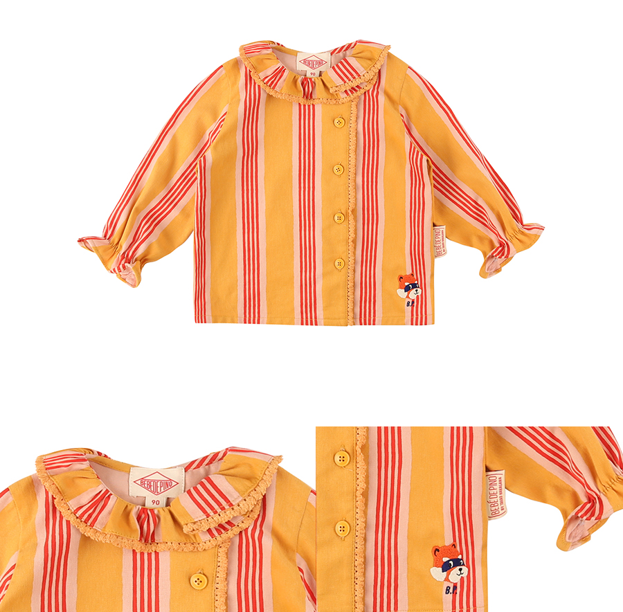 베베드피노 멀티 스트라이프 베이비 레이스 블라우스입니다. 도톰한 Cotton 원단에 베베드피노만의 유니크한 스트라이프를 전판 롤프린팅하여 제작하였습니다. 넥 러플과 끝단에 레이스 덧댐으로 사랑스러운 느낌이 가득한 아이템입니다. 이번시즌 베베드피노만의 유니크한 Lesser panda 오브제가 자수로 들어가있습니다.