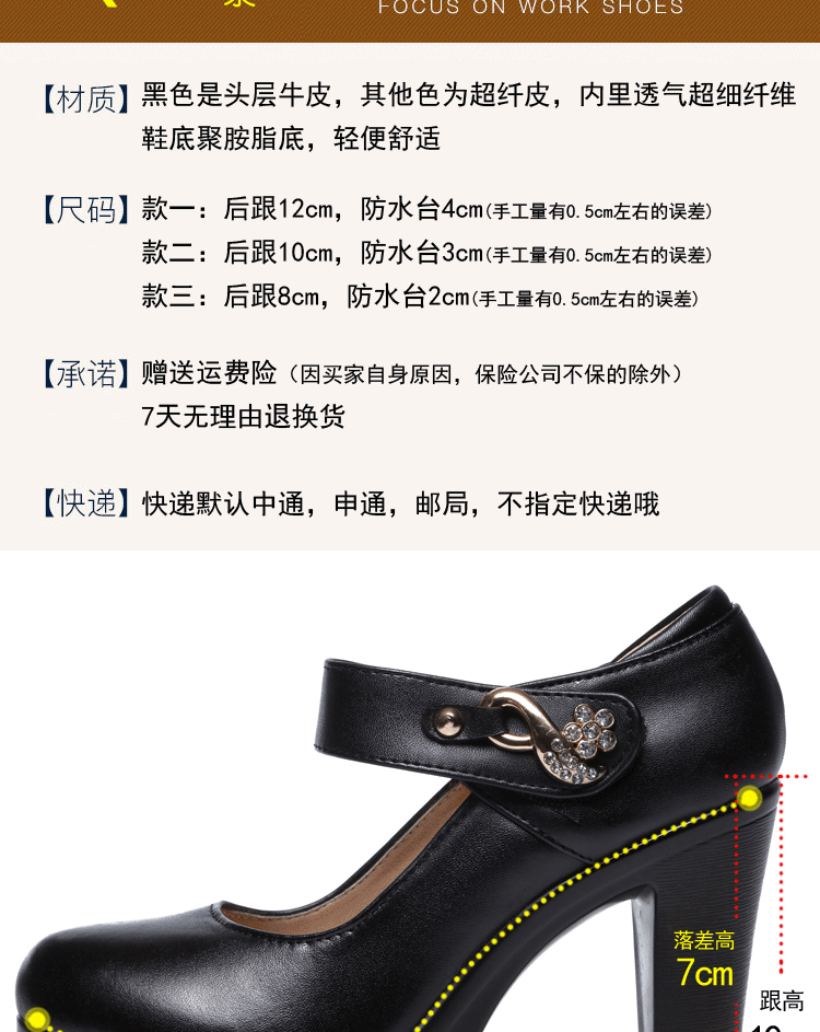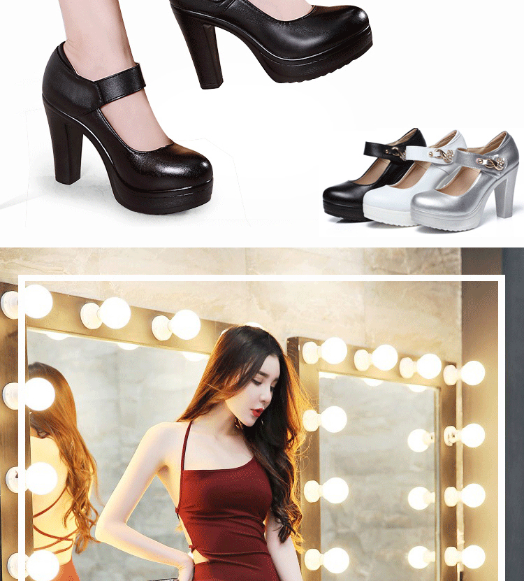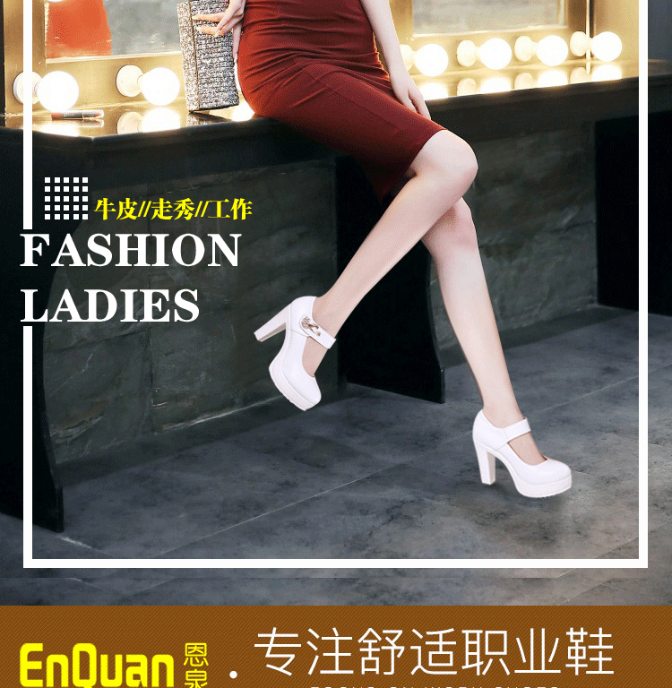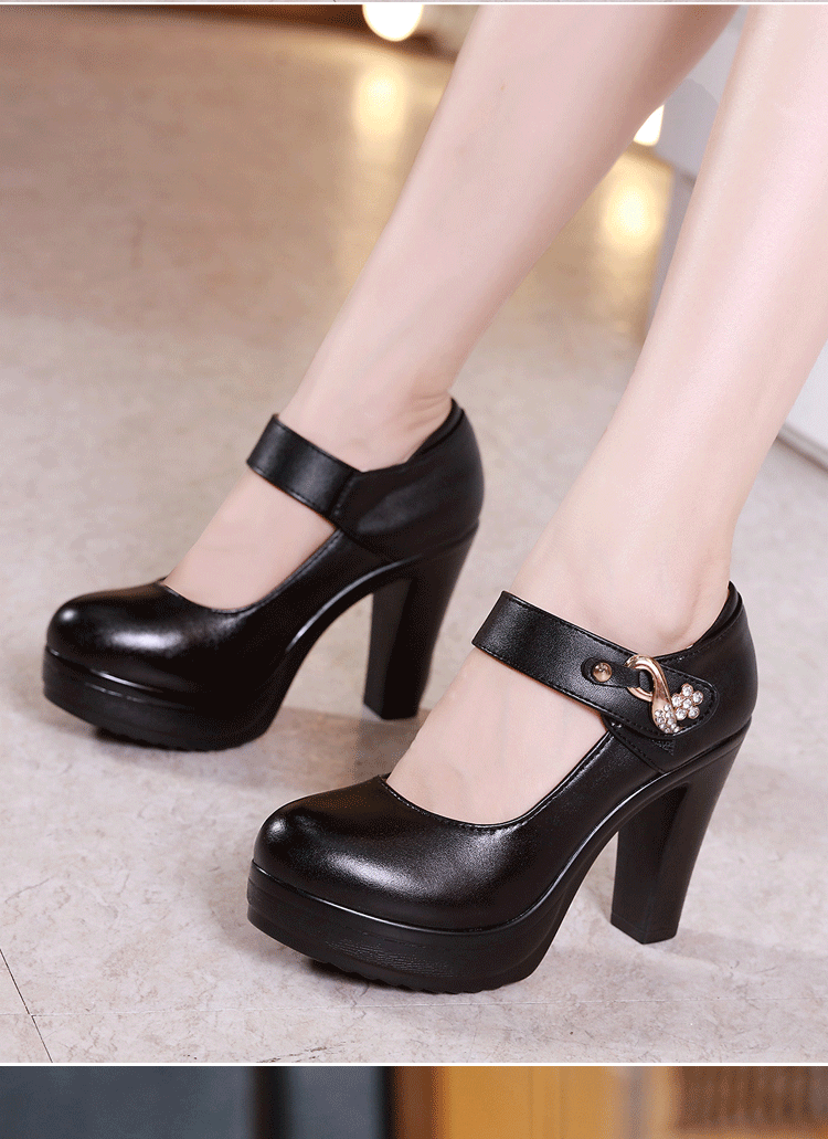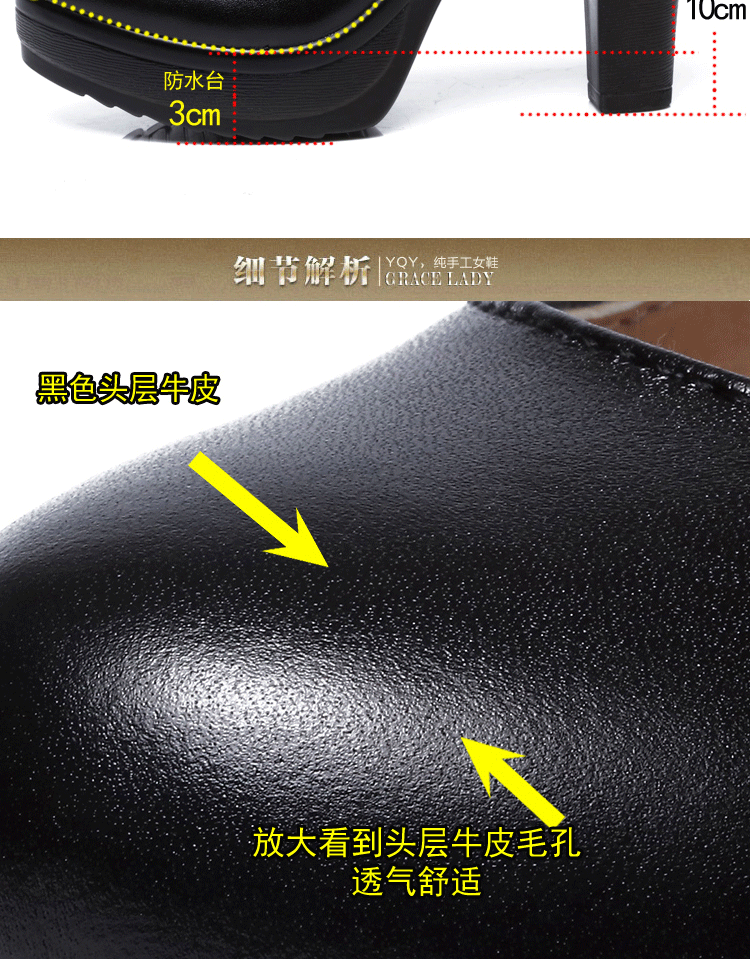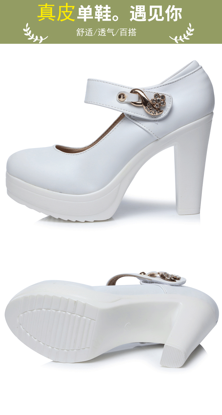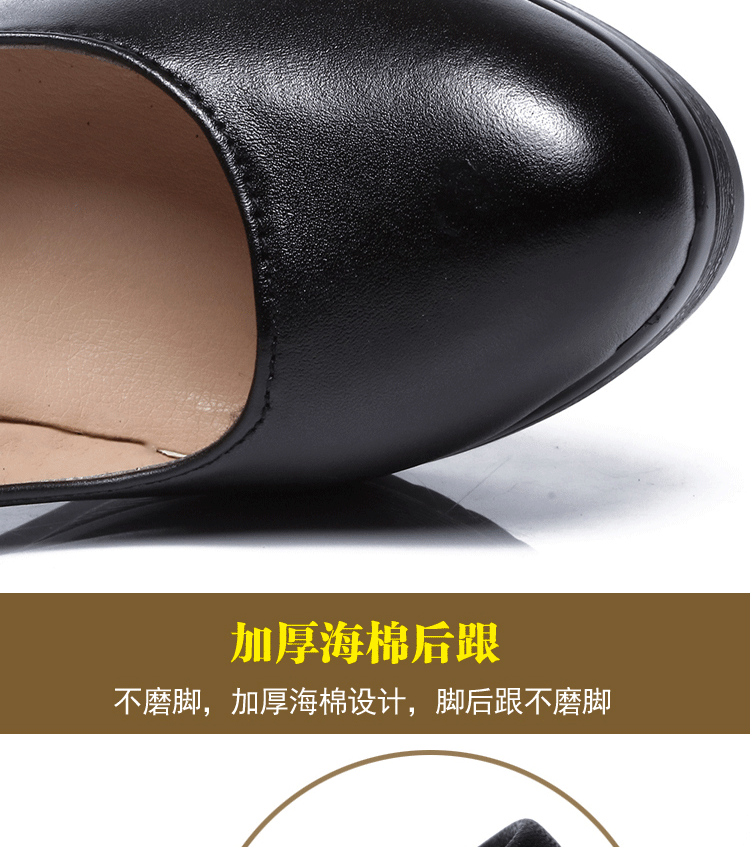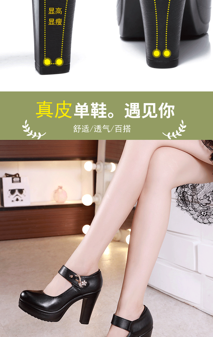 12CM头层牛皮舒适高跟单鞋模特真皮女鞋大小码浅口粗跟走秀工作鞋