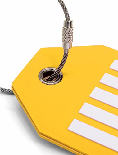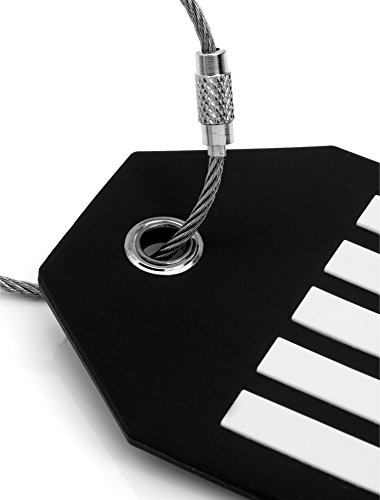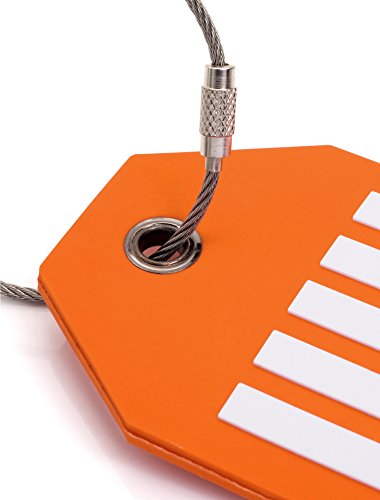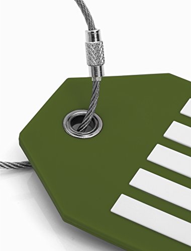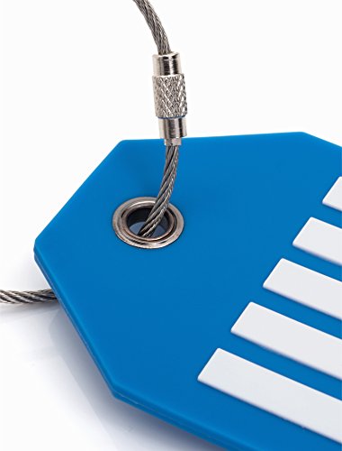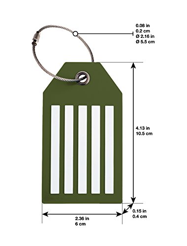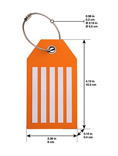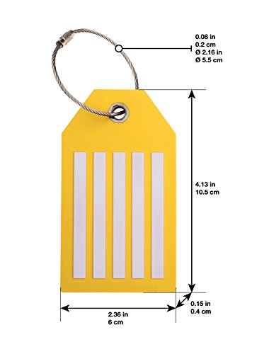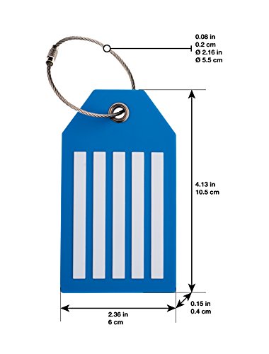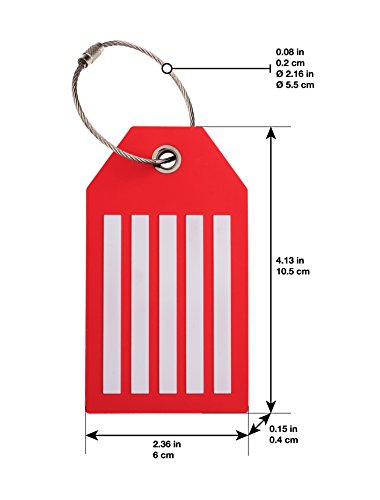PRODUCT SPECIFICATIONS ? Tag-Material: Indestructible PVC ? Attachment Material: High Grade steel cable and eyelet ? Tag size: 4.13" x 2.36" x 0.15" ? Tag Weight: 1 OZ ? Attachment Cable: 2" loop / 2mm thickness ? Colors: red, black, blue, orange, green, purple, yellow, and pink